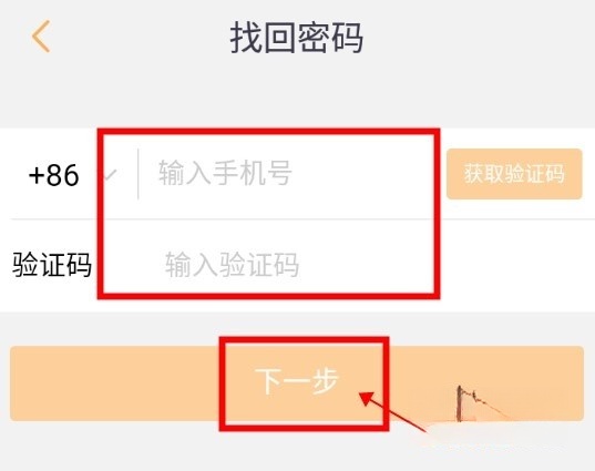 3、进入【找回密码】页面,依据提示填写手机号码与验证码。