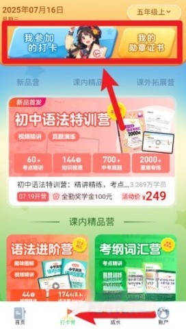 2. 在“打卡营”页面,可查看参与活动情况以及个人学习成就展示。