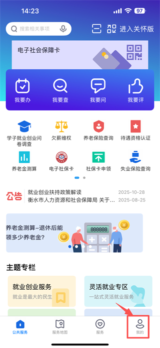 1. 开启人社服务类应用程序,轻点底部的“我的”选项,从而进入个人中心页面。