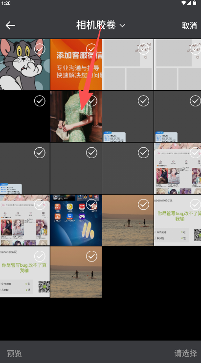 2、在“相机胶卷”相册中勾选需要精修的人物照片,点击右下角“预览”确认。