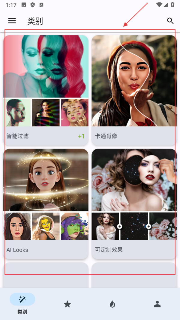 2. 来到类别界面,能够挑选【智能过滤、卡通肖像】等类别,以此提升图像创作体验。