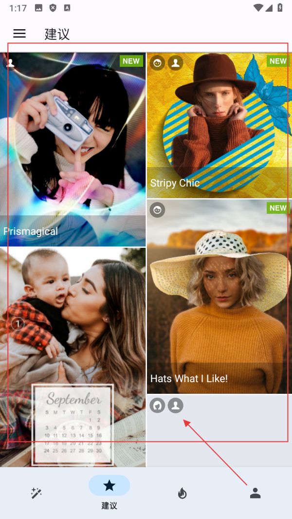 3、来到建议界面,能够【查看Prismagical、Stripy Chic】等建议相关内容,体验图像效果推荐服务。