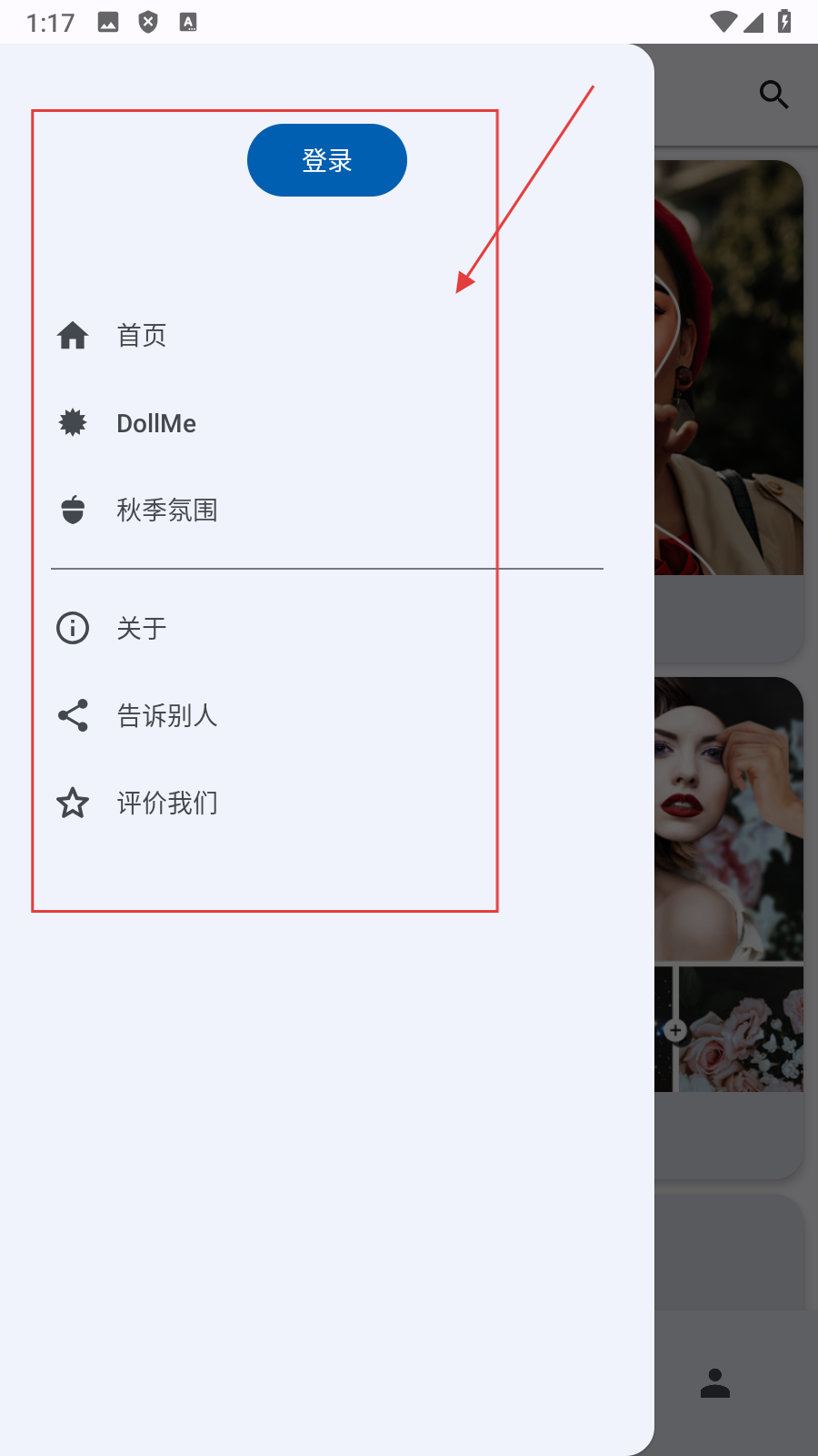 4、进入侧边栏界面,能够执行【登录操作,查看首页、DollMe等】这些功能,并管理应用相关设置。