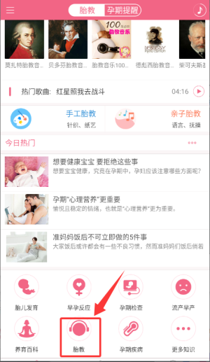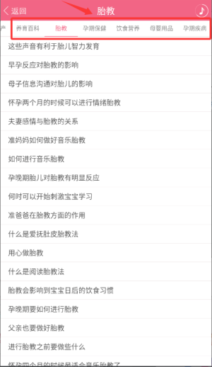 3、在应用界面中,挑选“胎教”板块,从而进入到与之相关的内容分类页面。