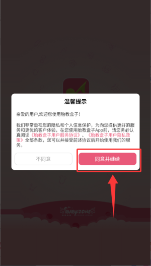 1. 于温馨提示窗口点击“同意并继续”,便能进入胎教盒子应用。