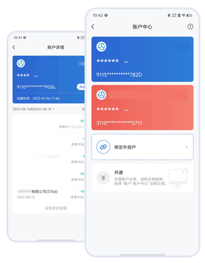 【账户中心】能够查询企业于平台所开设的各类账户余额、交易记录以及明细。