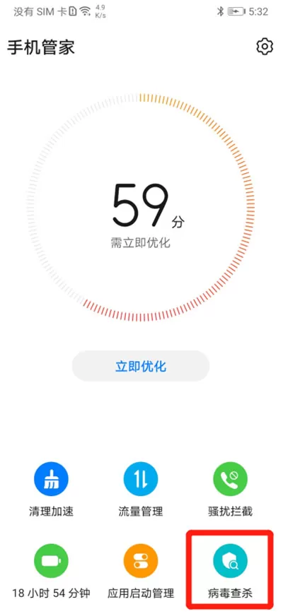 1. 打开“手机管家”,依次点击“病毒查杀”、“风险/应用管控中心”,查看应用是否处于风险项里。