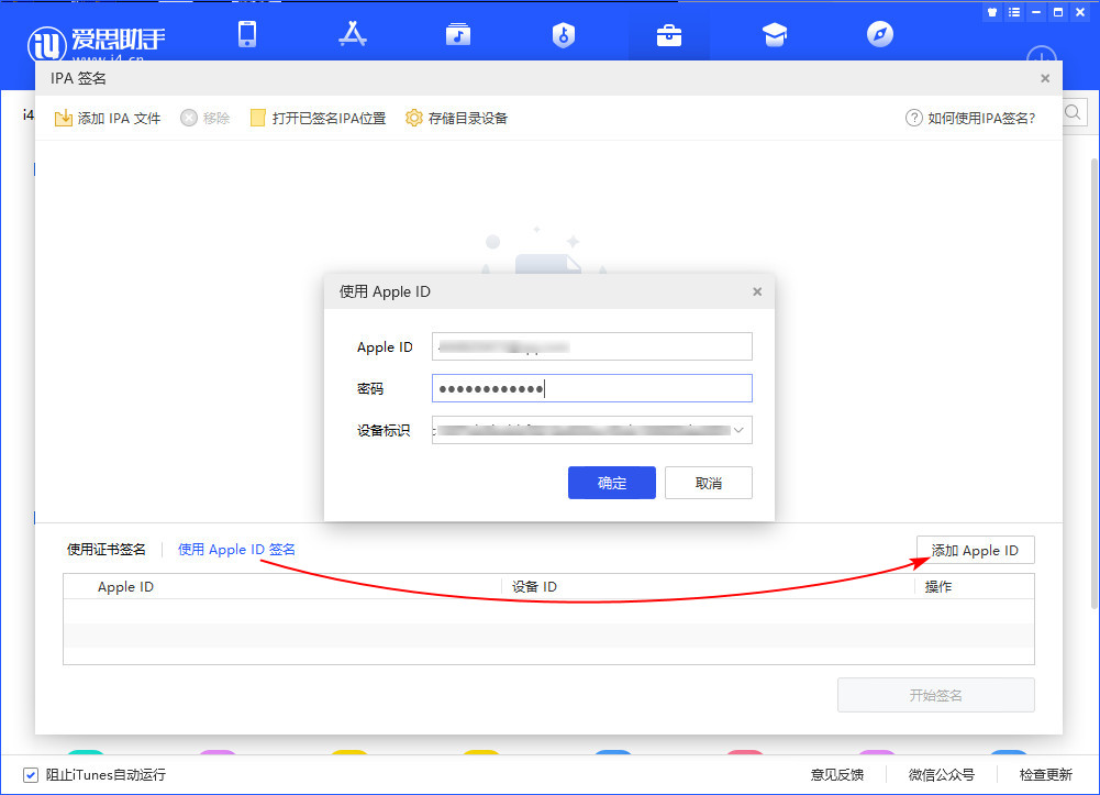 2、确认检查无误后,点击“确定”。在操作之前,建议先将iOS设备连接至爱思助手,确保能够读取到“设备标识”。若设备未连接,则需手动输入设备标识。Apple ID添加完成后,下方列表便会显示签名信息。