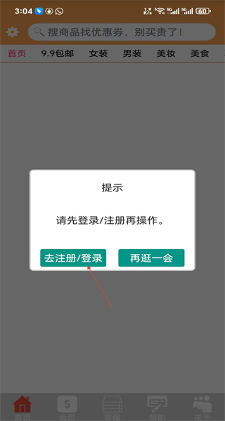 1. 打开软件,若出现提示需先登录注册的弹窗,点击“去注册登录”,即可进入账号操作界面。