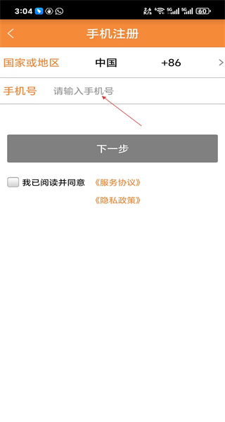 3、于手机注册页面,填入手机号码,选中服务协议与隐私政策,点击“下一步”,即可完成注册流程。