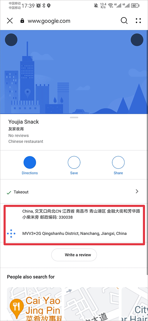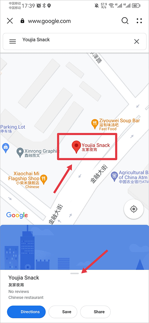4、点击后页面会上拉,此时就能查看店铺的详细位置、邮编、电话等信息。