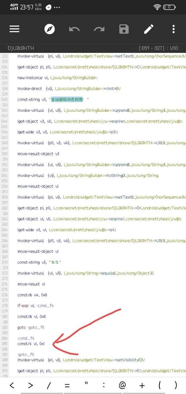 3、点击搜索到的下方这一项,向下翻至1285行,将const/4 v1, 0x0改为const/4 v1, 0x1