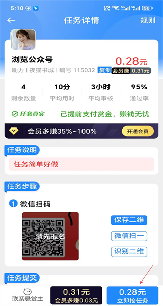 4、进入公众号浏览任务的详情页面,页面会展示奖励内容,同时有箭头指向“立即抢任务”按钮,此时就可以准备参与该任务。