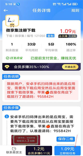 3、进入微享集的注册任务详情页面,该页面会展示奖励以及任务的具体步骤,同时有箭头指向“立即抢任务”按钮,此时即可准备参与此任务。