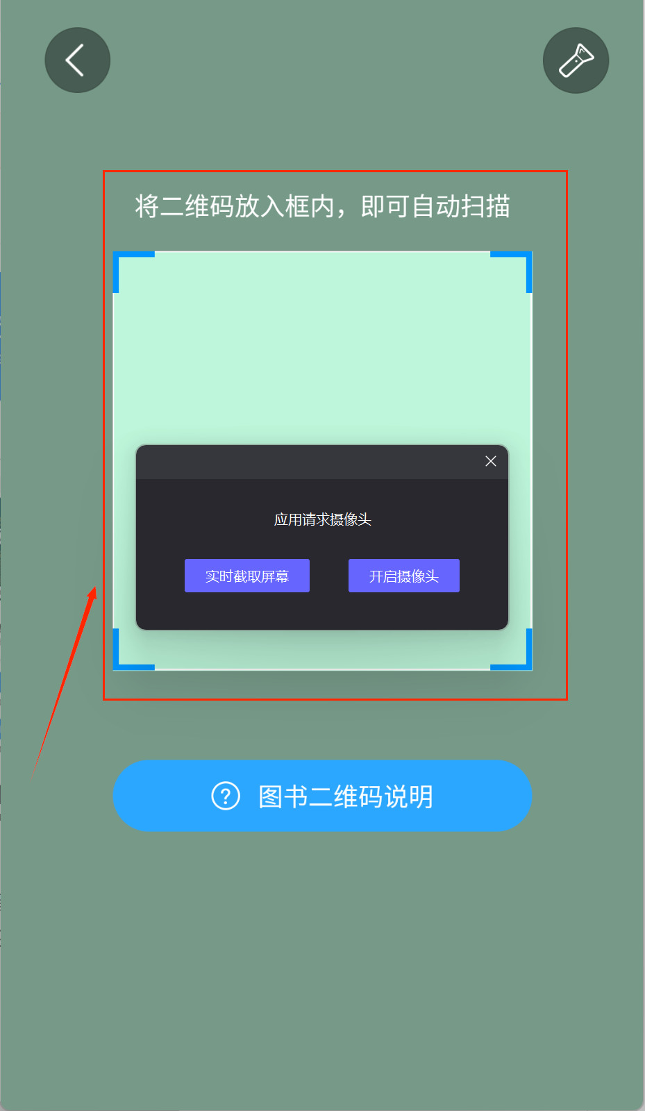 2、扫描图书时,请将图书对准绿底界面的蓝色框,系统会自动识别二维码。在此过程中,需记得允许摄像头权限,这样才能确保正常使用。