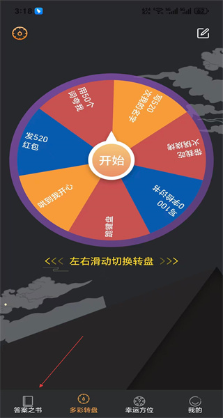 1. 开启软件后,进入多彩转盘界面,能看到标有不同内容的转盘以及开始按钮,接着点击底部的答案之书功能选项。