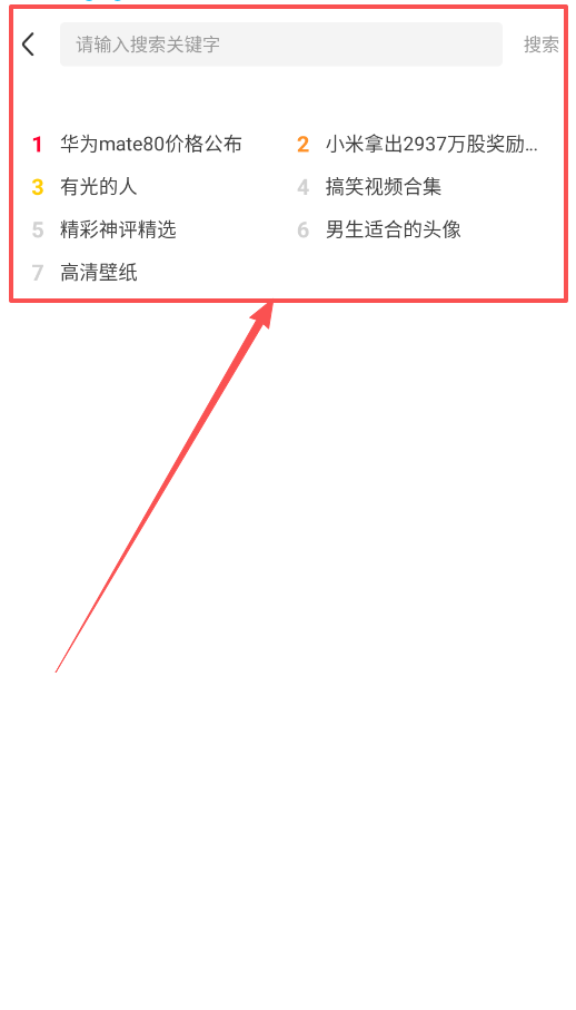 3、若要查找内容,可点击顶部搜索框,输入关键词,也能直接浏览热门搜索榜单,例如华为mate80价格、搞笑视频合集之类。