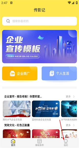 1. 打开软件,进入首页,首页上能看到企业宣传模板、企业商广以及个人生活分类。接着点击底部的“我的”,即可进入个人中心页面。