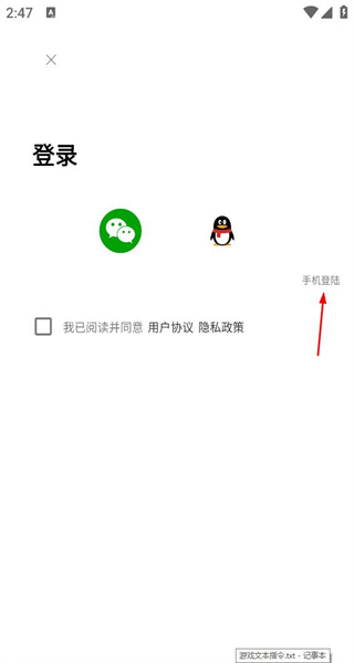 3、完成操作后,页面跳转至登录页面,在此页面可见微信登录、企鹅登录以及手机登录这几个选项,点击选择手机登录,随即进入专门用于填写手机号的界面。