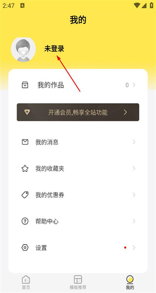 2. 来到个人中心页面,映入眼帘的是未登录状态,以及我的作品、开通会员等功能选项,随即打算开展登录相关操作。