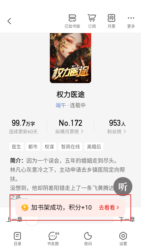 3、点击之后,系统会弹出提示“加书架成功,积分+10”,这表明书籍已顺利加入书架,如此一来,后续找书就便捷多了。
