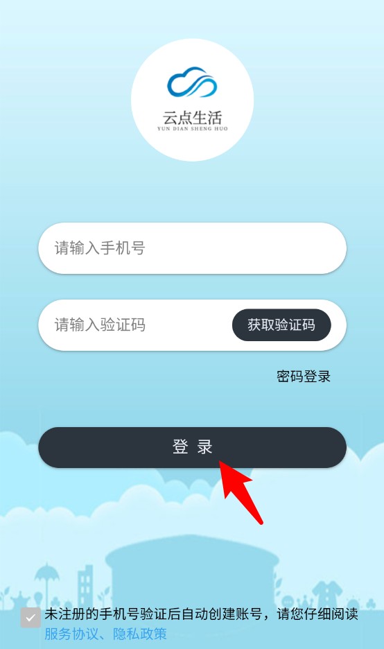 1. 打开云点生活App,输入手机号及验证码,就能完成快捷登录,迅速进入平台首页。
