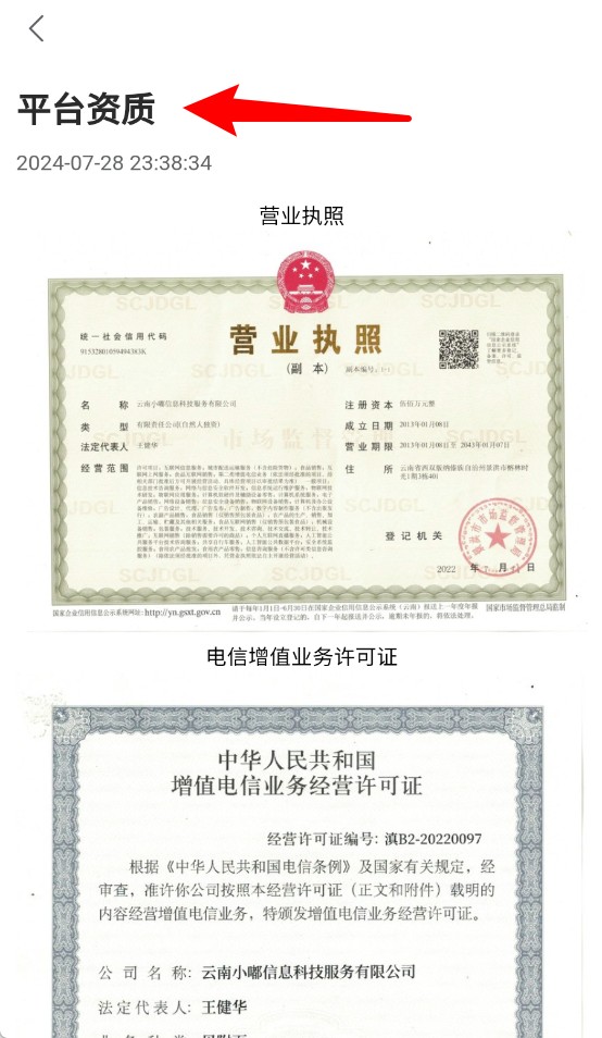 3、轻点平台资质栏目,即可查看营业执照与电信增值业务许可证,以此确保平台服务的正规合法性。