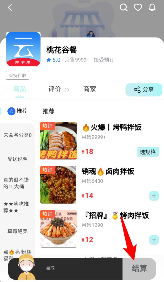 4、于点餐页面挑选心仪美食后,点击右下角“结算”按钮,随即进入下单支付流程。