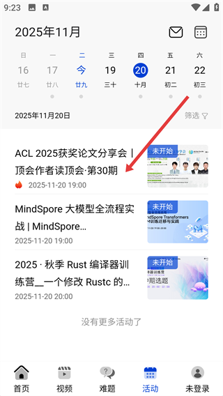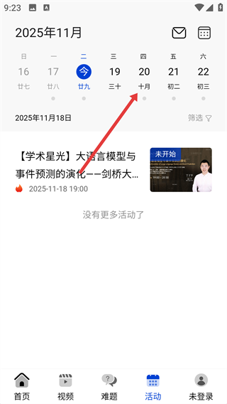 2、进入【活动】页面后,能看到日历界面,点击对应日期,即可查看该日期的学术活动安排啦。