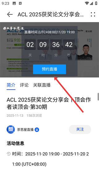 4、进入活动详情页后,看到心仪的学术直播,点击【预约直播】,就能及时参与精彩的学术分享啦。