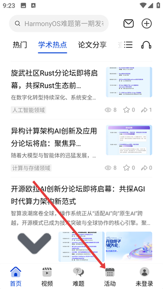 1、我们若想参与学术活动,可点击底部【活动】按钮,进入活动板块查看各类学术论坛、分论坛信息哦。