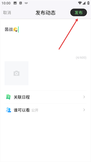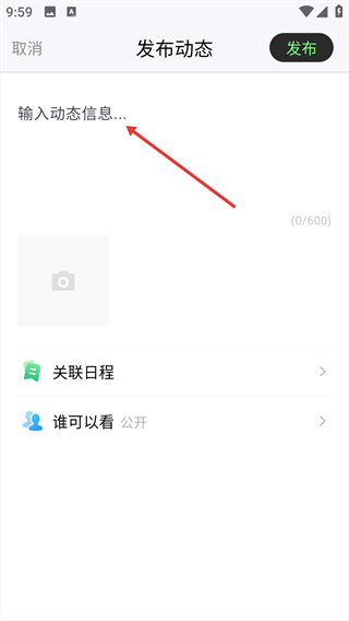 3、在“输入动态信息...”框内填写内容,此外还能够设置“关联日程”“谁可以看”等选项。