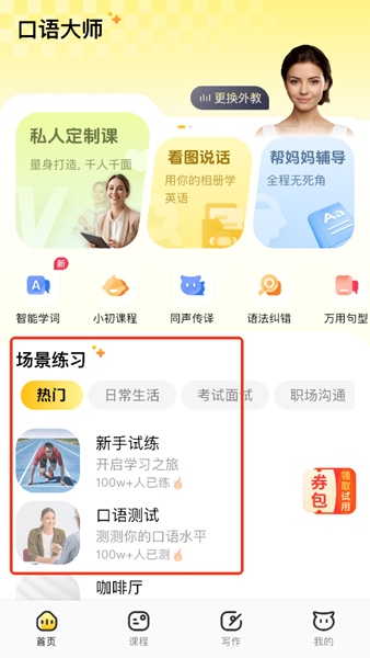 1、首先软件的首页就提供场景练习功能,你可以自由选择想要的场景进行口语联系。