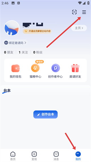 1、进入【我的】页面后,点击右上角的【菜单按钮】,即可展开功能列表。