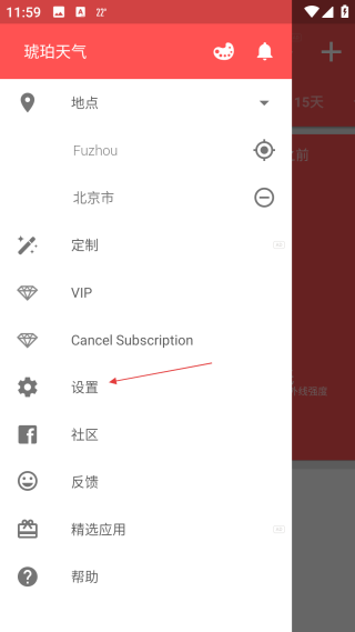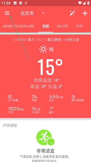 1、打开天气应用后,点击界面左上角的菜单按钮,即可进入功能菜单界面。