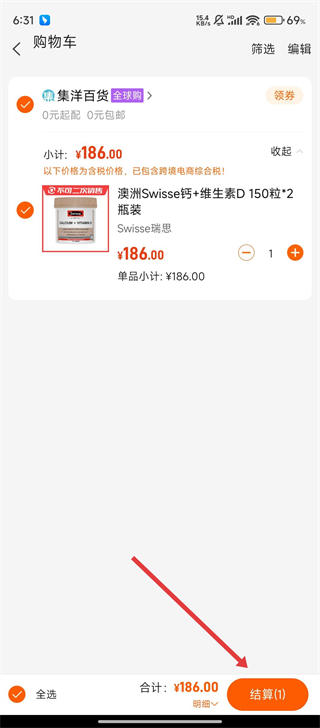 4、进入购物车,确认药品无误后,点击【结算】即可完成买药流程,轻松把药带回家。