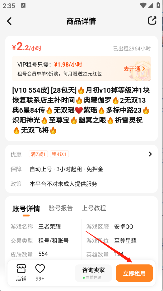 4、点开需要的账号进入详情页,点击“立即租号”即可。