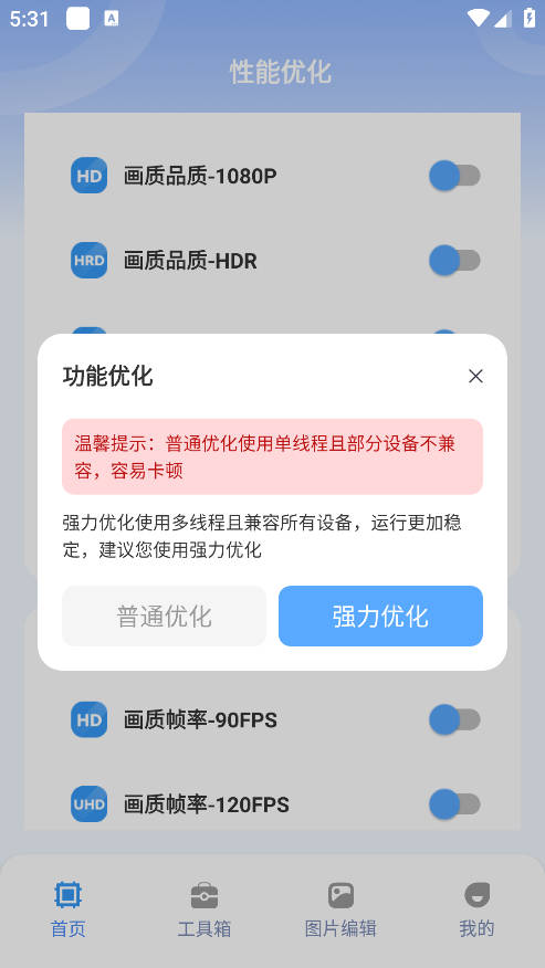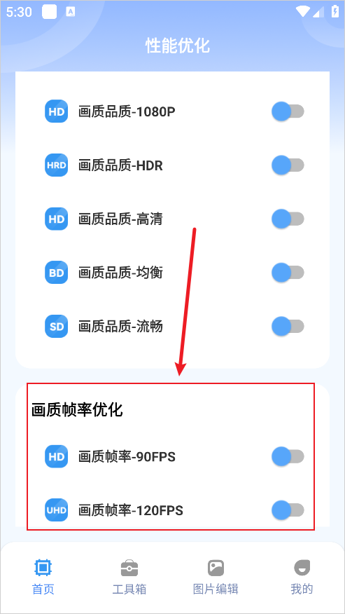 1、在本站下载画质兽助手最新版后,点击首页的画质帧率优化选项,选择120帧率。
