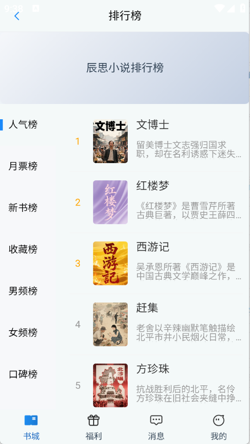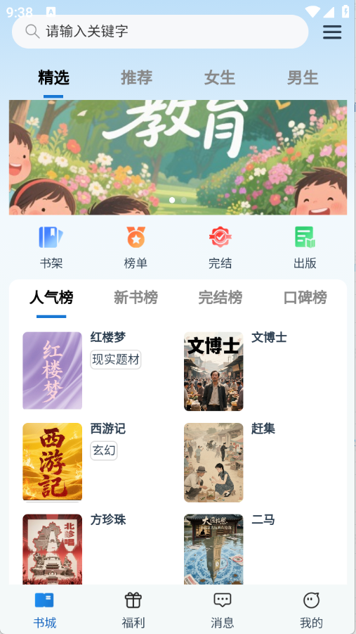 2、书城页面汇集了很多的小说资源,人气榜、新书榜以及完结榜等都有。