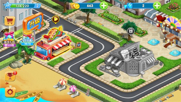 这款游戏总共有40个关卡,玩家需要通过当前关卡才能解锁下一关并获得升级机会。每一关系统设定的赚钱目标对应的收益会逐步提升,同时还会解锁更先进的厨房设备以及吸引忠实顾客等内容。其中,厨房升级是最为关键的,它会直接决定店铺的出餐效率。接下来,小编就以美食快餐车为例进行说明。