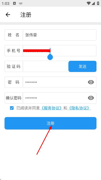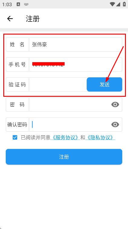 3在账号注册的界面中,需依次输入个人姓名与联系电话,随后点击“发送验证码”按钮以获取验证信息,最后完成登录密码的设定操作。