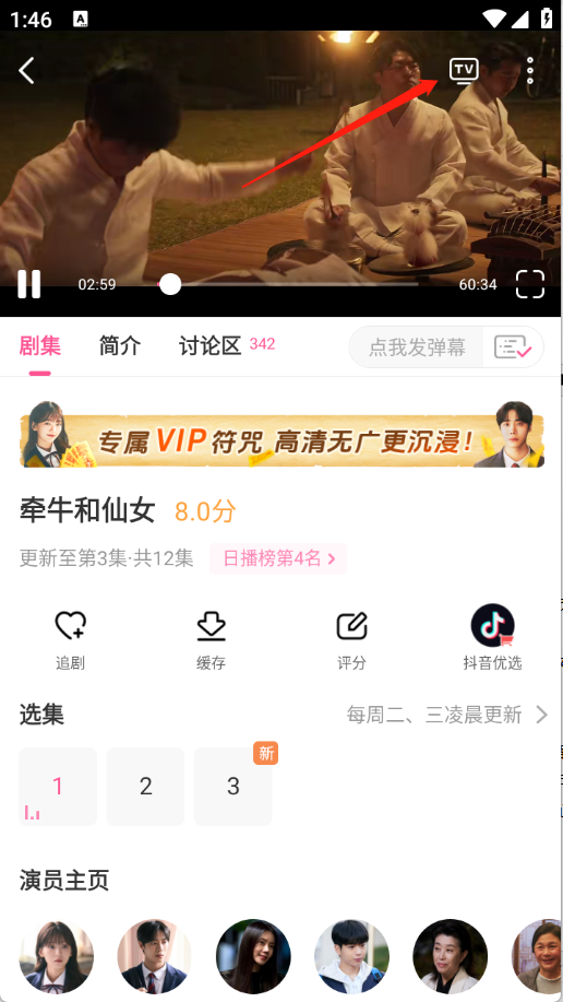 1、用户点开想看的影视资源以后进入播放页面,点击右上角的“TV”。
