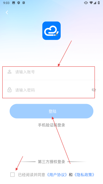 4、进入账号密码登录界面后,依次完成【输入账号与密码】、【勾选相关协议】的操作,再点击【登录】按钮,就能顺利完成账号登录流程。