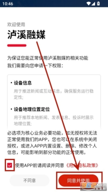 1首先完成泸溪融媒应用的下载安装操作,打开应用后找到隐私协议相关内容进行勾选,最后点击“同意并使用”按钮以进入应用使用流程。