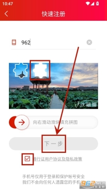 5输入手机号码,同意隐私条款,通过滑动操作完成拼图验证,最后点击“下一步”按钮即可。