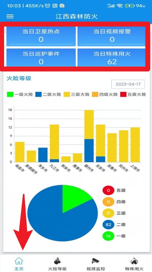 1打开应用首页后,找到带有“江西森林防火”标识的入口并点击,进入对应的主操作界面,在这里能浏览到当天由卫星监测到的火点热点、森林巡护过程中记录的各类事件以及其他重要信息。