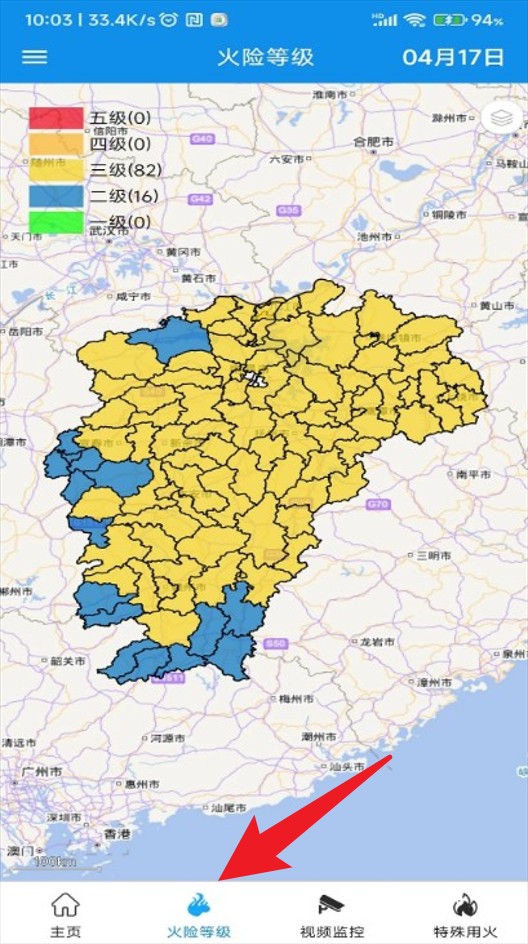 2. 点击下方的“火险等级”按钮,即可查看全省各区域的风险分布图,还能通过地图精准查看每个市县的火险等级。