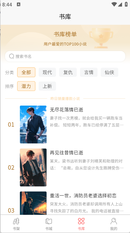 3、“书库”页面,将小说进行了详细的归类,包含言情、悬疑以及武侠等类型。