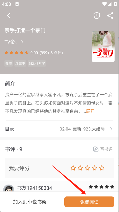 4用户找到感兴趣的小说资源后进入其详情页面,接着点击“免费阅读”按钮。