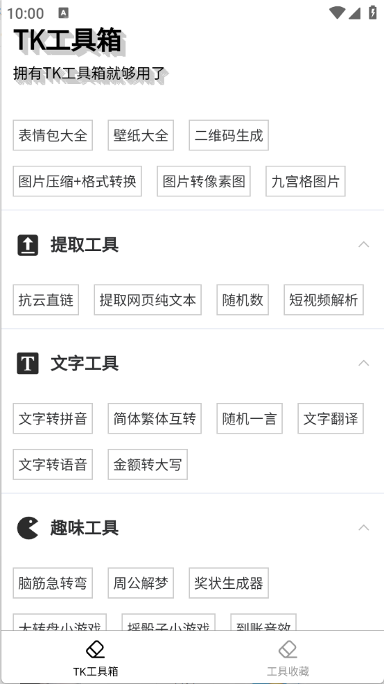 TK工具箱内汇聚了丰富多样的工具资源,涵盖图片处理、文字编辑、内容提取等多个类别,所有工具均支持免费使用。清晰的分类体系能让用户迅速定位所需工具,还能对常用工具进行收藏操作。此外,它占用空间小,可随时开启使用。